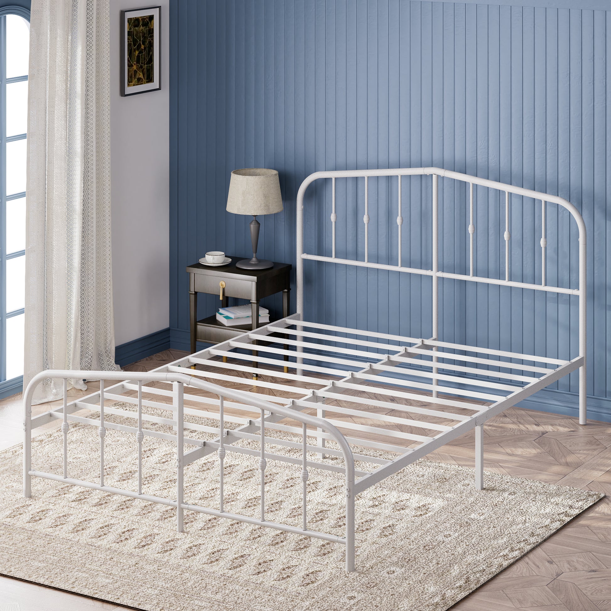 La Base de Cama Heidi Blanca combina la elegancia de un diseño clásico con la resistencia del acero moderno. Su cabecera ornamentada y curvas suaves evocan el encanto de los muebles antiguos, mientras que su estructura metálica sólida asegura años de durabilidad y soporte sin necesidad de somier.