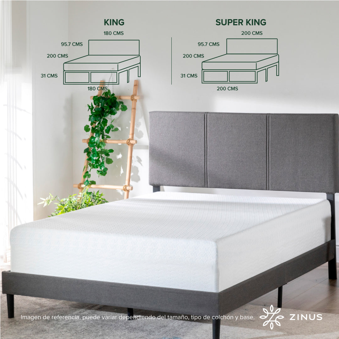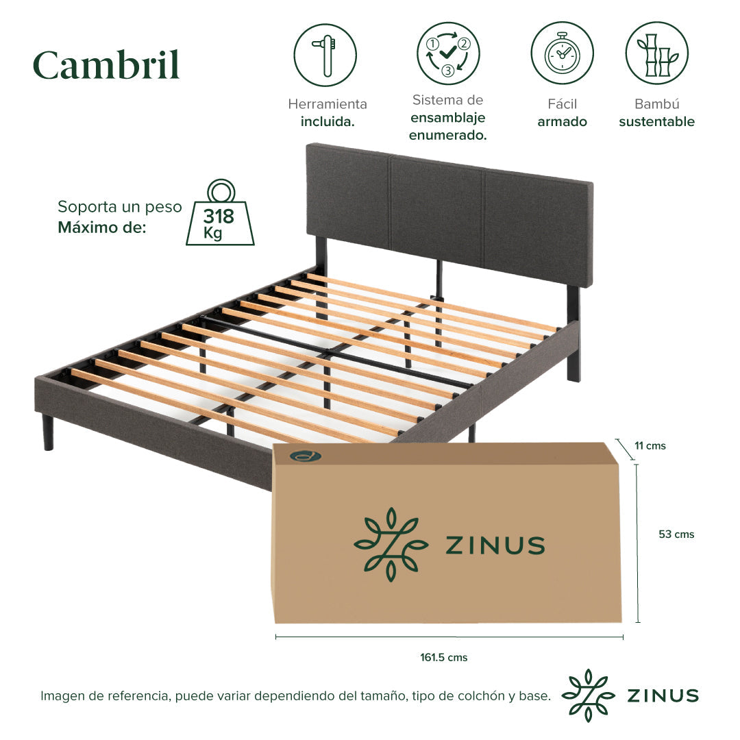 La Cama Zinus Cambril + Colchón Green Tea de 30 cm es el paquete ideal para complementar tu dormitorio. Su base con espaldar y estructura de fierro tapizada en tela cuenta con listones de bambú que brindan mayor soporte a tu colchón de memory foam con esencia de té verde, manteniéndolo fresco toda la noche. Se entregan en caja para facilitar el transporte al dormitorio e incluyen todas las herramientas e instrucciones necesarias.